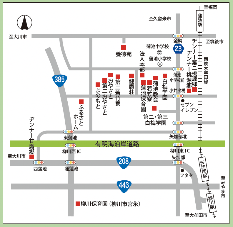 西鉄大牟田線 柳川駅下車 車15分西鉄大牟田線 蒲池駅下車 徒歩20分九州自動車道 八女インター 車25分